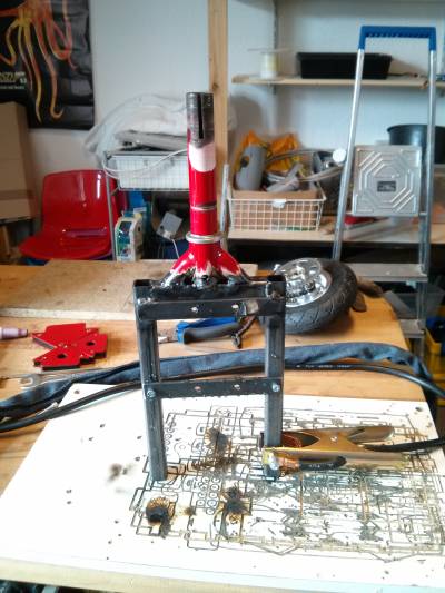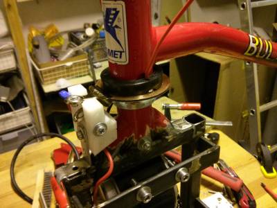 Der Motor hatte da noch keine Verstellung und die Kettenspannung war frei Schnauze. Nicht so optimal. Ich hatte dann einen Versuch gestartet, wie man den Strom per Schleifring übertragen bekommt, aber (oh Wunder) stellte sich heraus, über diese kleine Büro-Klammer lassen sich keine 30A übertragen.
