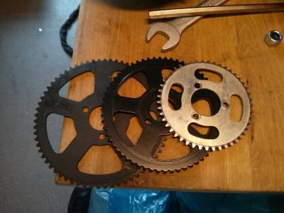Als nächstes wurden verschiedene Ritzel bestellt um zu probieren was am besten läuft. Hier stellt sich heraus, dass der kleine Motor nicht genug Leistung hat und wir eine hohe Untersetzung wählen mussten. Noch größere Ritzel mit mehr Zähnen wären noch besser gewesen, aber dann wären wir auf dem Ritzel anstatt dem Reifen gefahren.