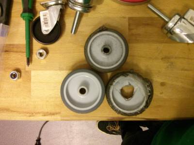 Die Baumarkt-Rollen wurden dann durch Skate-Rollen mit Kugellagern ersetzt. Diese halten deutlich länger.