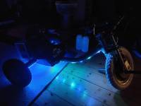 Für die Unterboden-Beleuchtung (kam 2022 dazu) kommt ein WS2812 Strip zum Einsatz. Ein einfacher kleiner ESP mit WLED steuert das ganze an. Ein Button vom Lenker geht auf einen IO um die gespeicherten Presets zu wechseln.